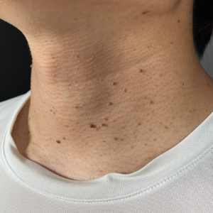 施術前は首から肩にかけての筋肉がかなり肥大しています。ボトックス注射をして1ヶ月後はとてもスッキリした印象です。肩周りが華奢になり首も長く見えるようになりました。